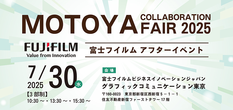この度「顧客と共に栄える」を社是とするモトヤは「元気な印刷業界」の実現のお役に立ちたいと考え、富士フイルムビジネスイノベーションジャパン株式会社様 ショールーム「グラフィックコミュニケーション東京」にて、コラボレーションフェア「富士フイルム アフターイベント」を企画させていただきました。次のビジネスチャンスを一緒に考える機会として、是非ともご来場賜りますよう、お願い申し上げます。