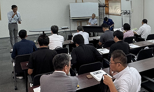 富士精版印刷株式会社 代表取締役社長 吉賀様と執行役員工場長 奥村様より、ご挨拶と今回の「高積紙揃機 ミューパイルジョガーmini」増設の背景をご説明いただきました。