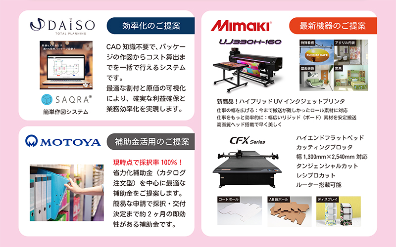 さて、「顧客と共に栄える」を社是として、創業104周年を迎えたモトヤは、この度、大創株式会社様、株式会社ミマキエンジニアリング様と共に「3社共同 2026パッケージソリューションフェア」を、下記の要領で開催させて頂く運びとなりました。