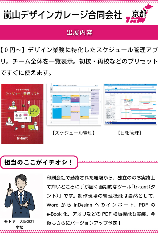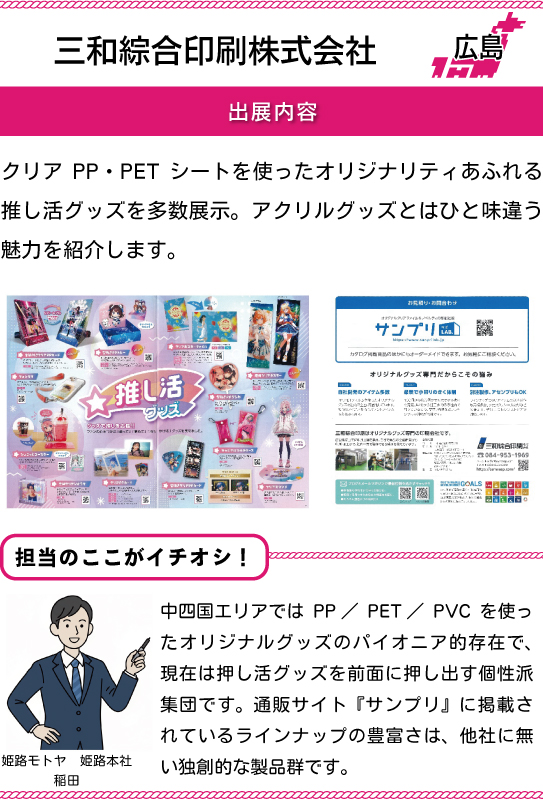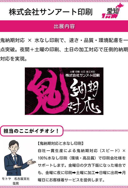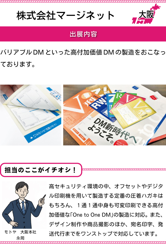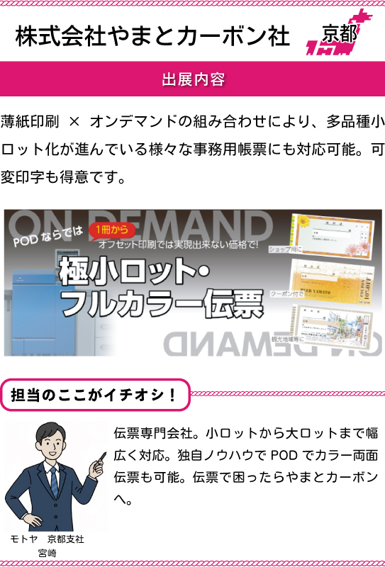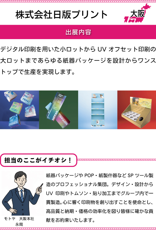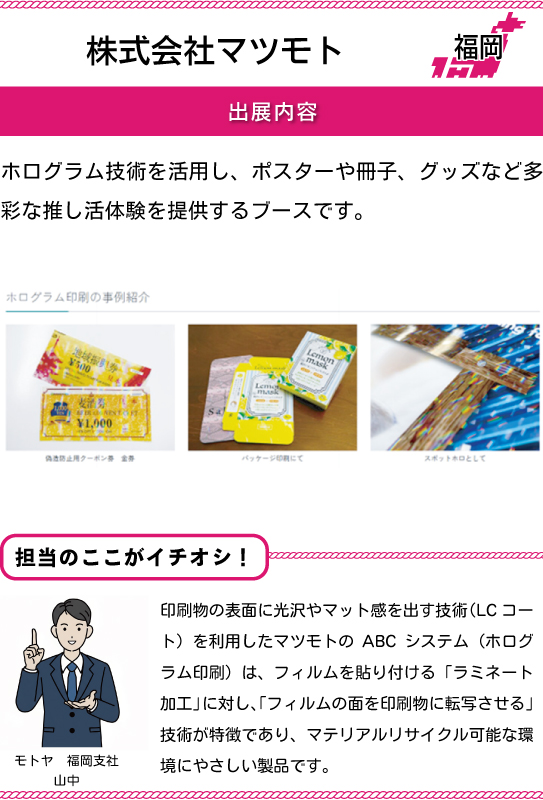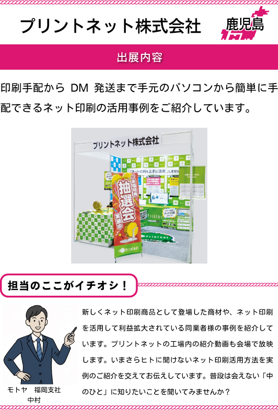 会場では「コラボレーションゾーン」「創注ゾーン(オーダーグッズコーナー/自動化コーナー/省力化補助金カタログ型登録メーカーコーナー)」「環境ゾーン」「人材ゾーン」「モトヤゾーン」の5ゾーンを展開し、付加価値のある儲かる商材をお持ちの多くの印刷会社様に全国からご出展いただきます。