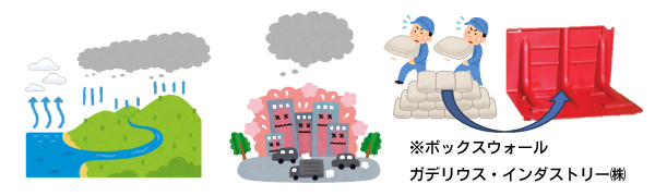 では、これら集中豪雨への水害対策としては、土のうを積み上げて建物への水の侵入を防ぐ方法がありますが、土のうは1袋で約20kgもあり、水害対策に必要とされる高さ45cmまで積み上げるとなると2~3袋分の高さが必要で、わずか1mの幅に土のうを積み上げるだけで、大人2人で1時間ぐらいの重量作業となります。袋や土砂の準備まで考えると、急ぎで必要な分を用意するのは不可能なため、予測が難しい集中豪雨には対応ができません。