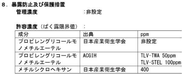 つまり、濃度基準値は法的に超えてはならない限界値、許容濃度はばく露濃度の目安、管理濃度は法的な作業場環境の評価基準です。許容濃度と管理濃度については、SDS(安全データシート)の「8.ばく露防止及び保護措置」で確認できます。そして、許容濃度と並んで表記されているのが、米国産業衛生専門家会議(ACGIH)です。これは米国基準の許容濃度という位置づけで、TLVという約700物質について様々な基準値が設定されており、以下の3つに分かれています。