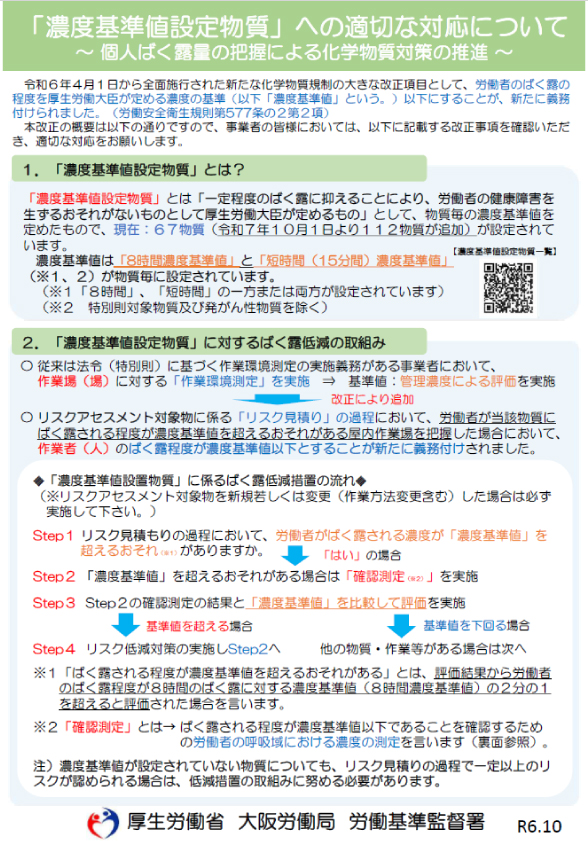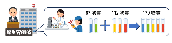 そこで、化学物質の「濃度基準値」ですが、労働者のばく露量(吸い込み量)がこの濃度以下であれば、健康障害は起こらないと判断される限界値で、労働安全衛生法で定められた179物質を製造、または取り扱う屋内事業場は、労働者のばく露濃度を濃度基準値以下にすることが義務付けられています。