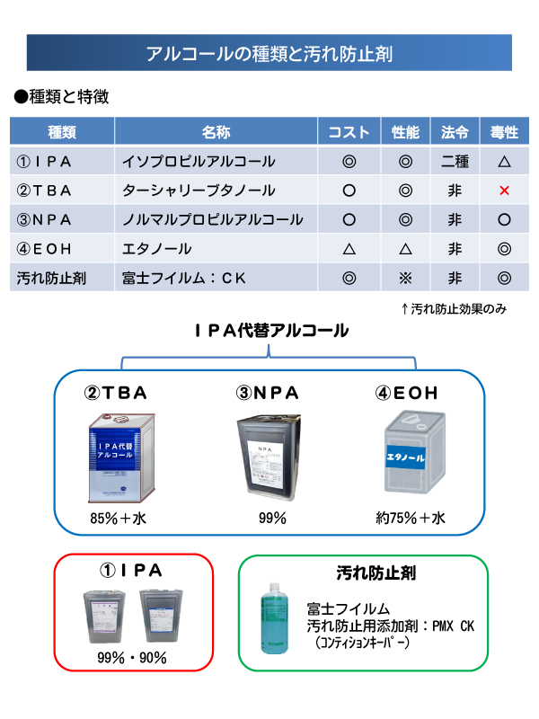 その理由は、湿し水用のアルコール自動添加装置が、IPAを添加した際の「表面張力」で添加するしくみであり、IPAとNPAは化学式が全く一緒(C3H8O)で、構造が少しだけ異なる構造異性体なので、IPA99%品とNPA99%品は互換が可能であり、IPA99%品と互換可能なTBA85%品とも互換が可能な関係です。
