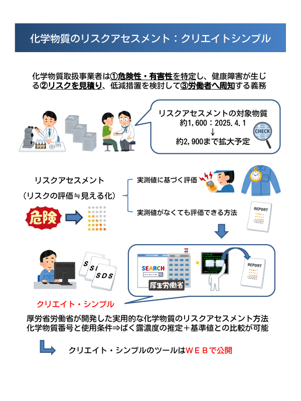 そして、含有製品の選別ができたら、次のステップは現在の使用条件下で、濃度基準値以下での運用になっているかの確認です。これには実際の現場で環境測定を行い、実測値から判断する方法がありますが、手間と費用面から考えて、すぐに環境測定をするのではなく、まずは実測値がなくても簡易的に推定して評価できる方法をお勧めします。それが、CREATE-SIMPLE(クリエイト・シンプル)という厚生労働省が開発した実用的な化学物質のリスクアセスメント用ツールです。