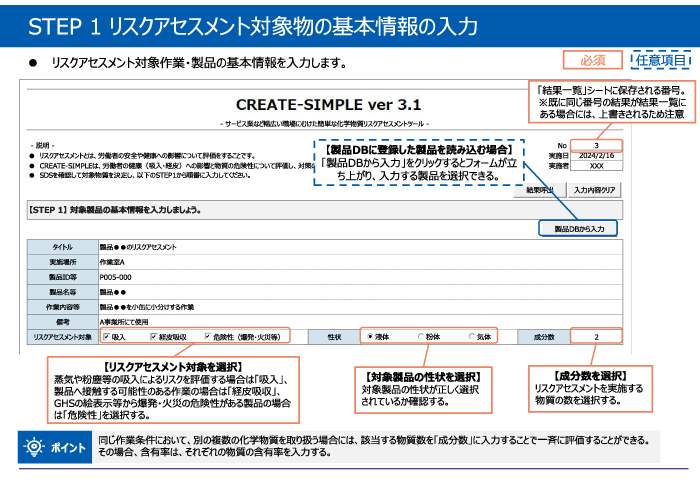 「トップ」の説明タブから「リスクアセスメントシート」のタブを選んで、以下の【STEP.1】基本情報を製品ごとに入力します。※リスクアセスメント時:SDSの通知対象物質、濃度基準値設定物質:前回ご紹介の9種類を参照。