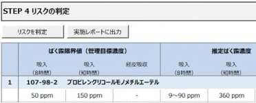 今回の例では平均的な取扱量での入力で、ばく露限界値が50ppm⇒推定ばく露濃度9~90ppmという結果でしたが、推定ばく露濃度が超過すると、この製品は使えないという事ではなく、この結果から【STEP.5】リスク低減対策の検討が可能です。